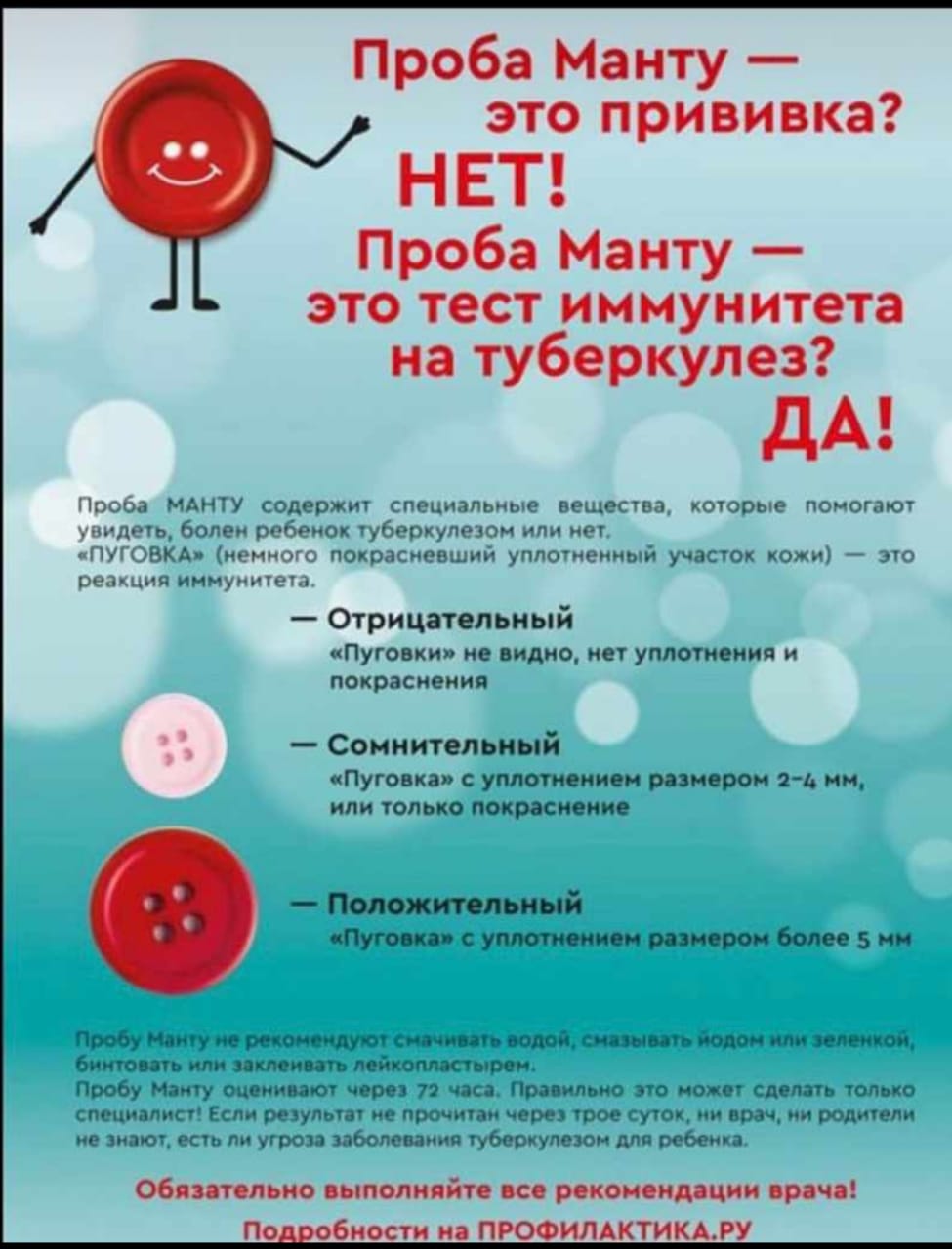 Реакция Манту – это не прививка!!! Она не служит для выработки иммунитета. Это тест на определение иммунитета к туберкулезу и тест для раннего выявления туберкулеза у ребенка.