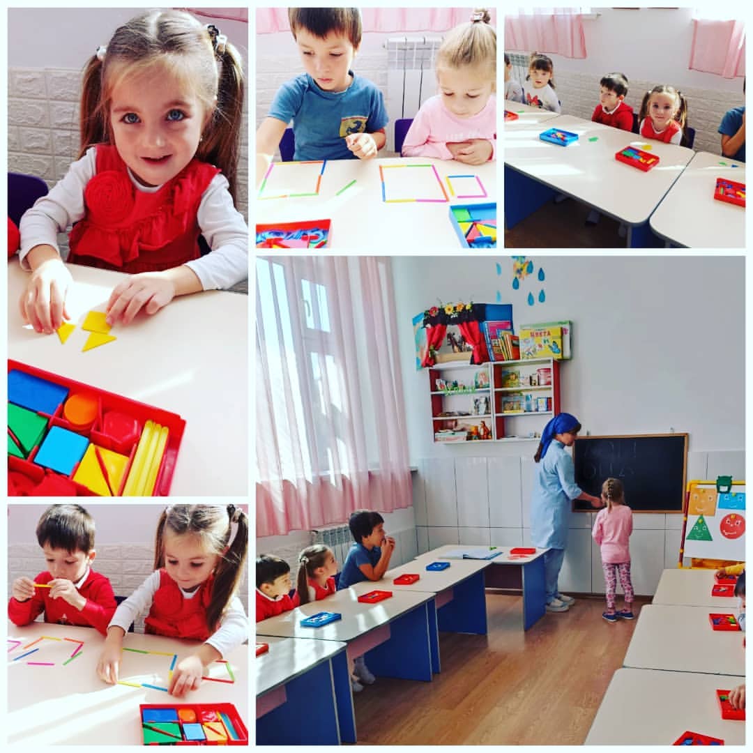 Цель: упражнять детей в составлении геометрических фигур на пласкости стола.